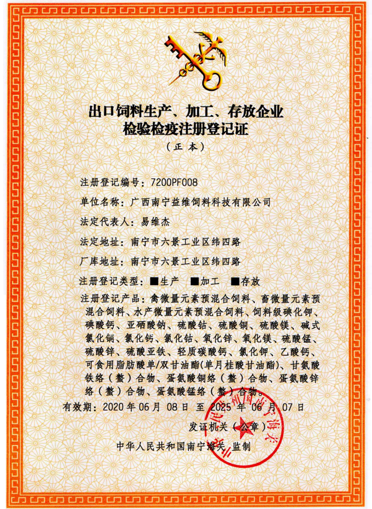 益維—出口飼料生產(chǎn)加工存放企業(yè)檢驗檢疫注冊登記證